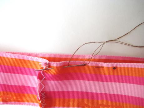 Cut out 15 inches of the wider ribbon, fold it and zig zag stitch the two ends together. If your satin ribbon has right and wrong sides, take care to do the zig zag on the wrong side.