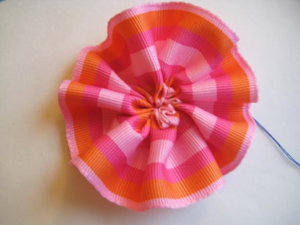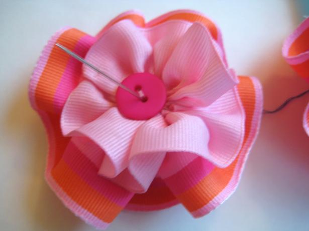 Take 10 inches of the narrow ribbon and repeat the above steps to get a smaller flower. Keep the smaller flower over the bigger one, keep a button in the center and sew in place