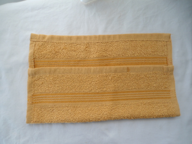 Align the sides and draw four lines using a fabric pen, dividing the towel into four equal parts as shown above. Insert two pieces of satin ribbon, about 10 inches long, just in between the two layers of the washcloth as denoted by the arrow and pin it in place.