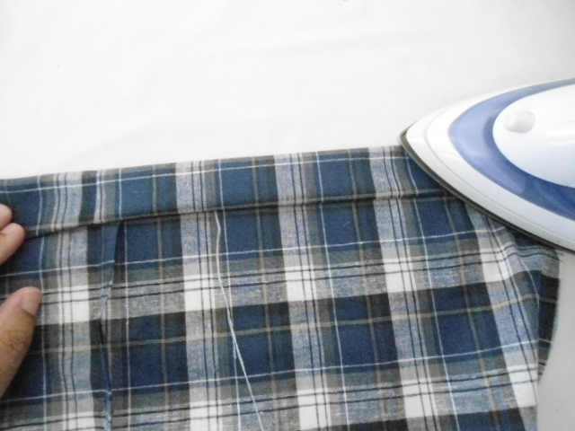 Fold the lower edge of the shorts by 1/2-inch and press. Fold by another 1-inch and press again. Sew down the hem. Repeat the steps on the other leg of the shorts.