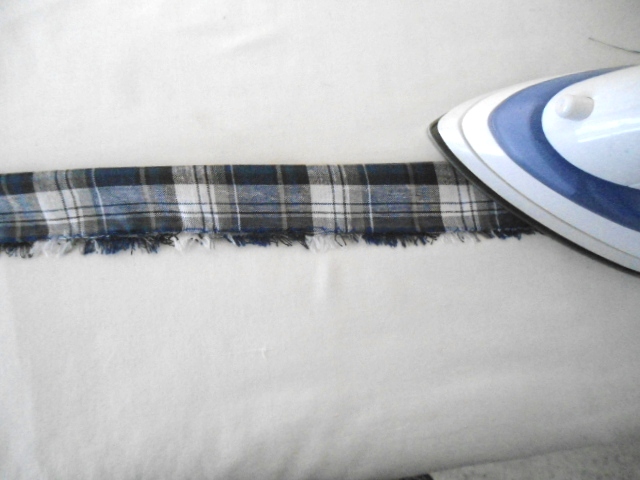 Now take the waistband piece and fold it lengthwise in half and press (picture not shown). Open it and fold one of its longer edges towards the wrong side by 3/8-inch and press again.