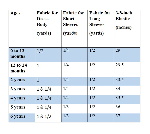 Cotton fabric in a coordinating color for the sleeve- requirement specified in the table below ( optionally you may use the same fabric as the dress body).