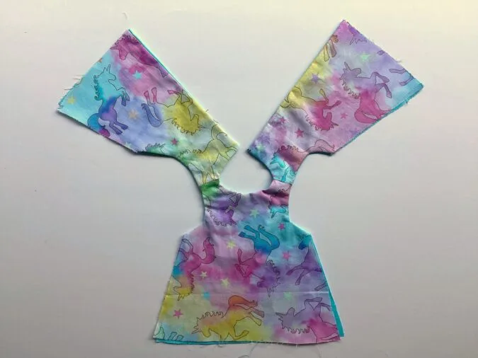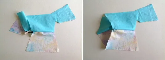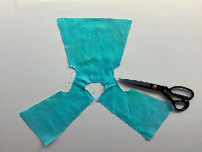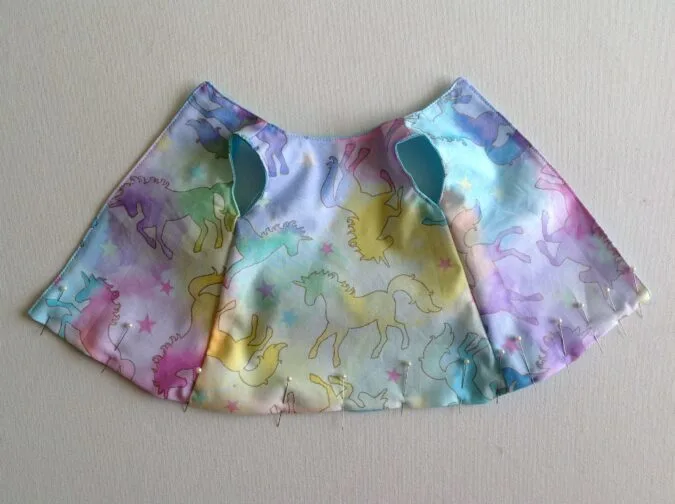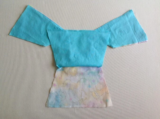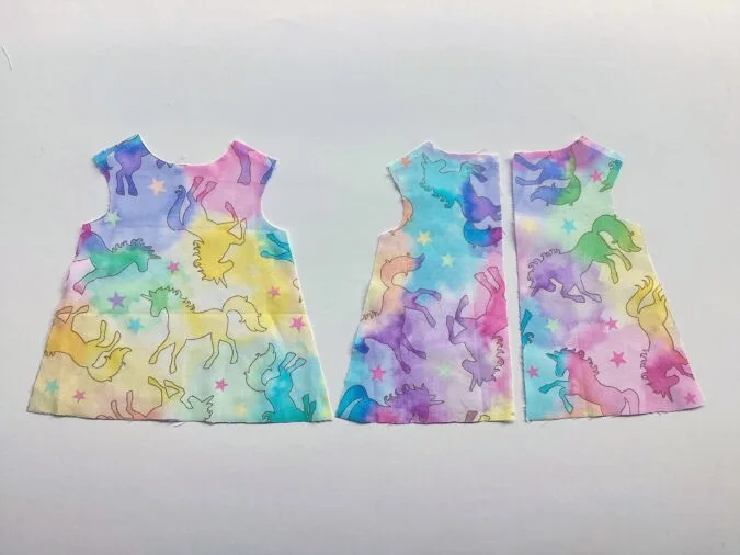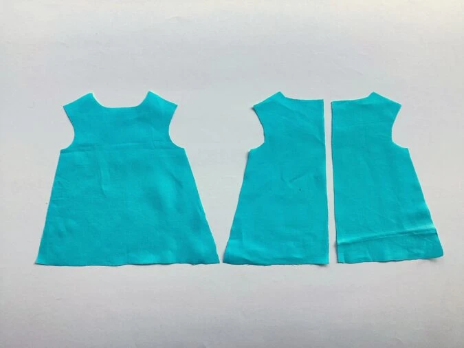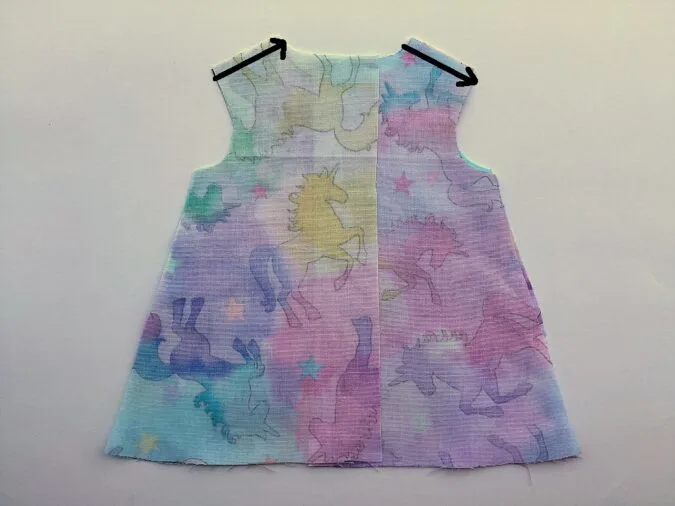 Take the two dress back pieces and place them over the dress front piece, with the right sides together, aligning the shoulders and side seams and sew the shoulders shut.