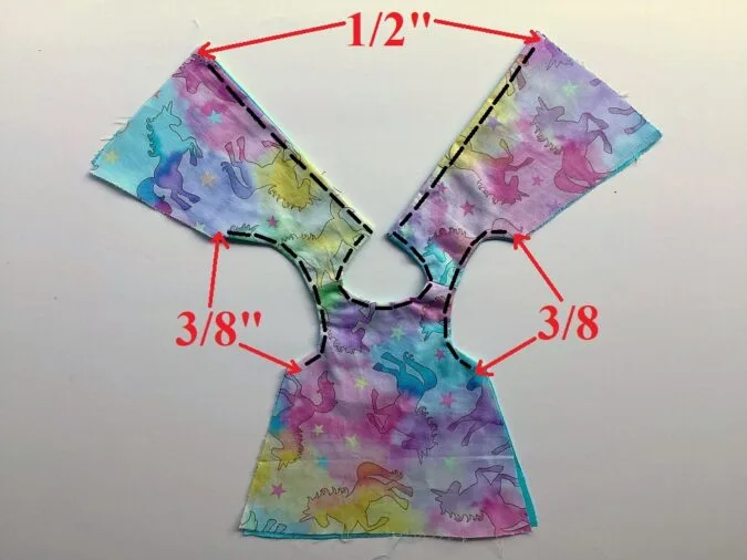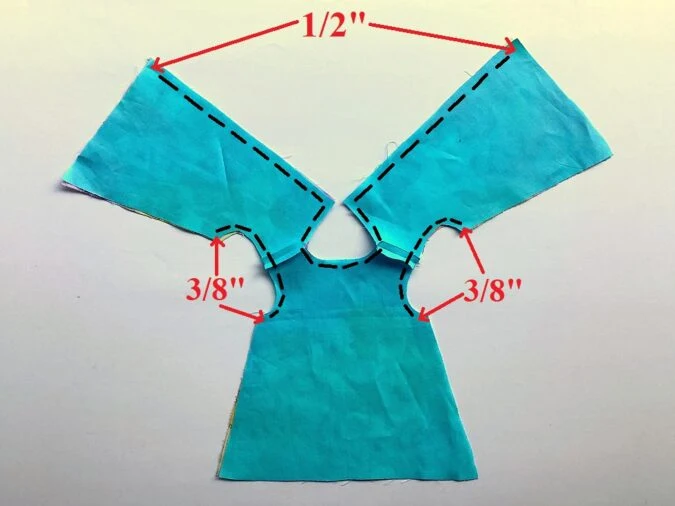 Place the dress lining over the dress outer, with the right sides together, aligning the center back, neck and armholes. Pin and sew along the neck and center back, and also along the two armholes. *Note that you need to leave 3/8-inch along the lower edges of the armholes and 1/2- inch along the lower edges of the dress back, as marked.