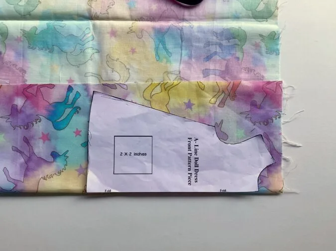 Take the dress outer fabric and the template for the front. Fold the fabric to fit the width of the template and place the template on the fold. Mark around it and cut to get the dress front piece. Repeat the steps to get the front lining.