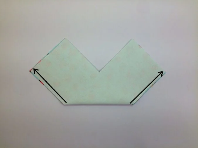 Fold the piece along the diagonal of the small center square, bringing the opposite raw edges together on both sides. Align the edges, pin and sew along both sides.