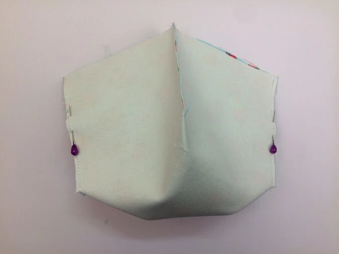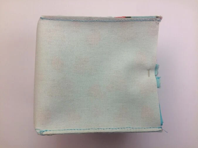 Next, realign the piece and fold it along the other diagonal of the center square to match up the remaining raw edges. Pin and sew along the edges to join.