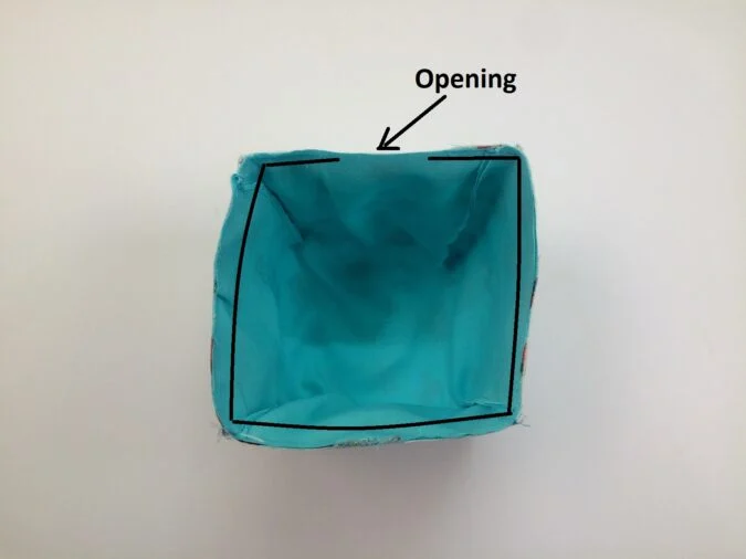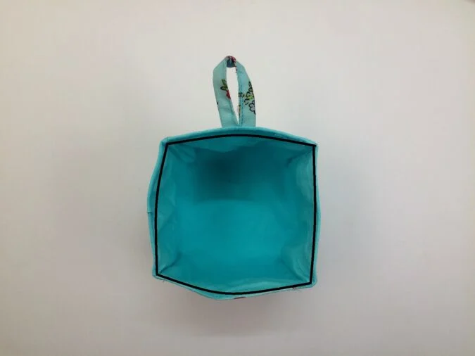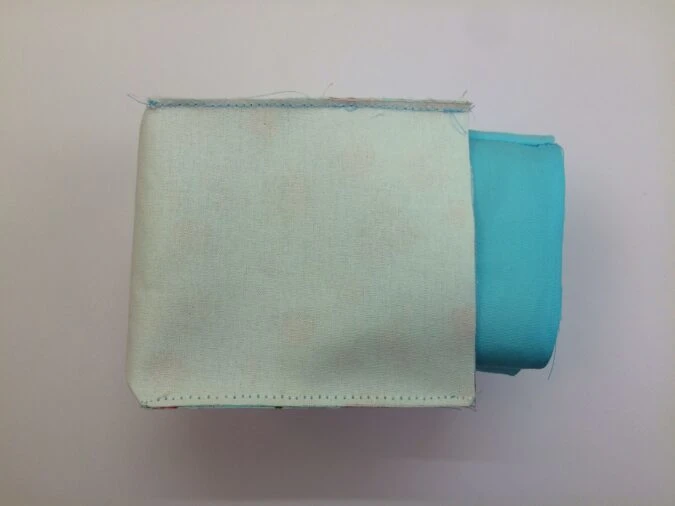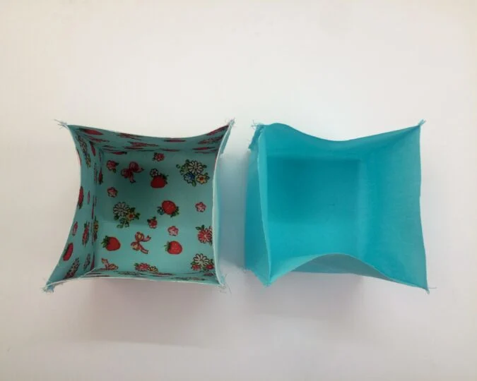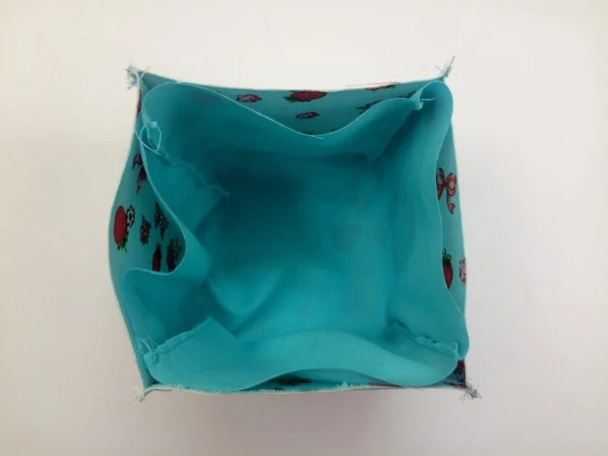 Keep the basket outer on its wrong side and flip the lining over to its right side. Slide the lining in to the outer, keeping the side edges in line.