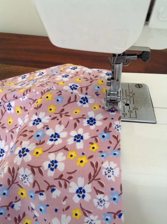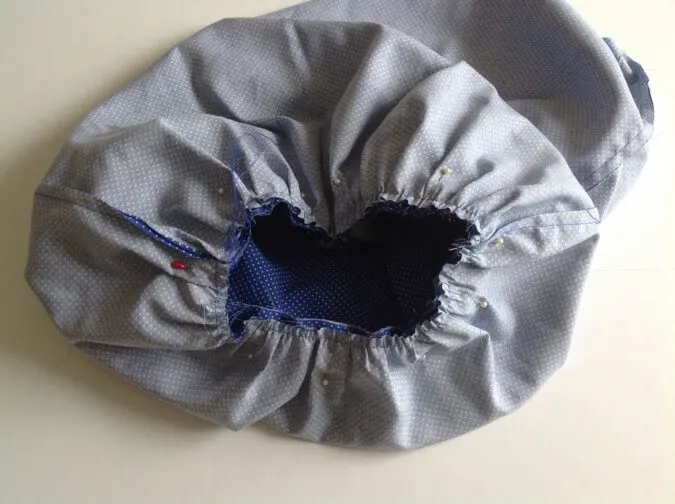 1) Sew a basting stitch between the points marked earlier. Pull the thread from the bobbin gently to gather it.