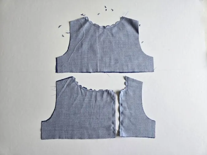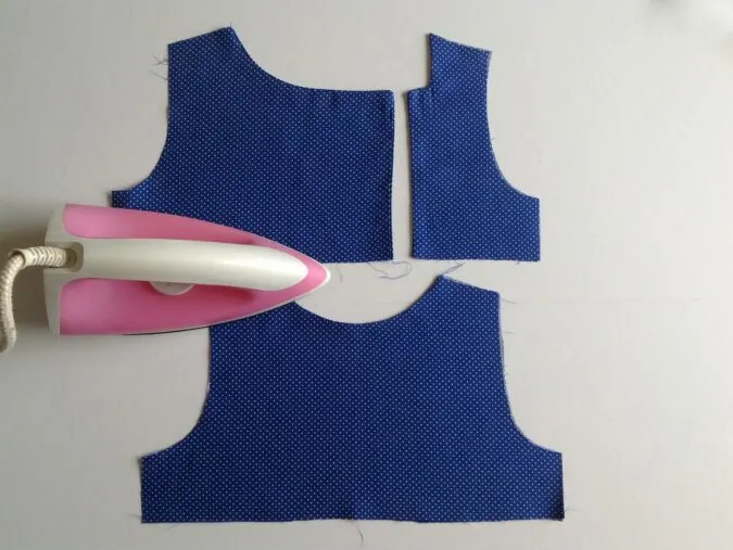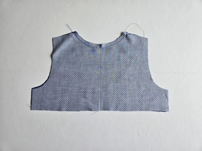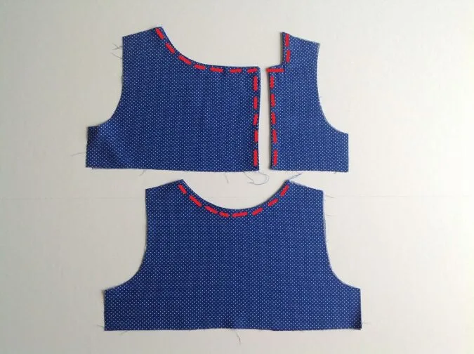 Next, layer the back bodice and lining pieces and sew around the neck to join.