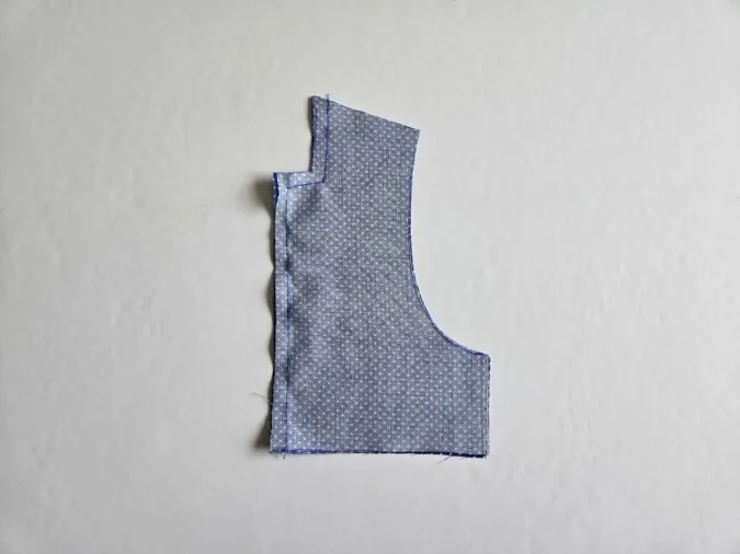 Take the front bodice piece A and the lining piece, layer them with the right sides together, aligning the edges and sew along the neck and button edge, leaving a 3/8-inch seam.