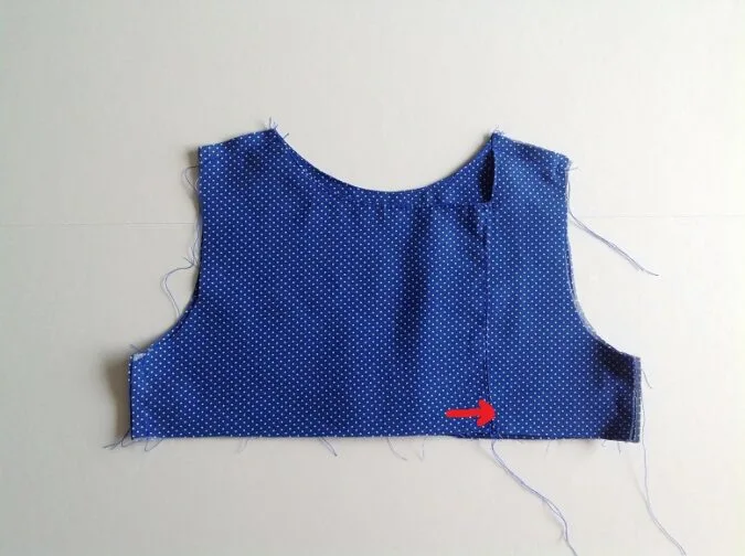 Next, sew the overlapping part of the front bodice shut, 3/8-inch from the lower edge. ***Make sure to keep the back bodice away while sewing.