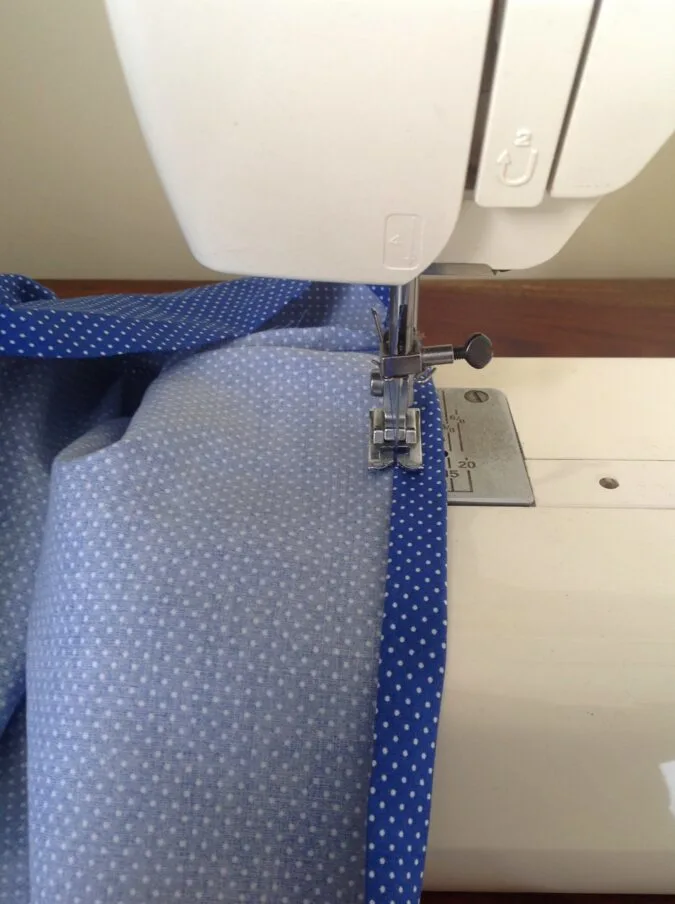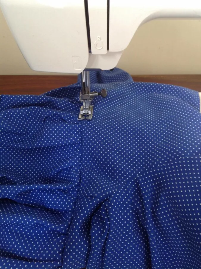 Sew a basting stitch, 3/8-inch away from the top edge of the skirt. Leave a long tail of thread, of about 5 to 6 inches long to pull and gather the skirt (picture for illustration purposes).