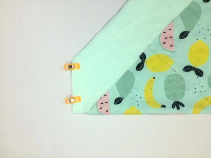 Fold the corner with the right side of the front fabric facing out and edges aligning. Put clips to hold the edges together. (picture for illustration purposes).