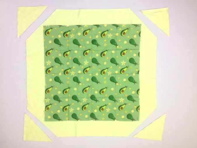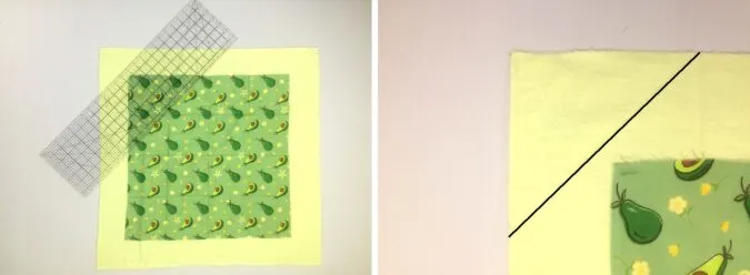 Place your ruler at 45 degree angle to the sides and 1/2- inch above the corner of the inner fabric. Draw a line to mark.
