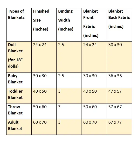For example, for a finished blanket size of 30″ × 30″ with a 2.5″ binding, you will need: