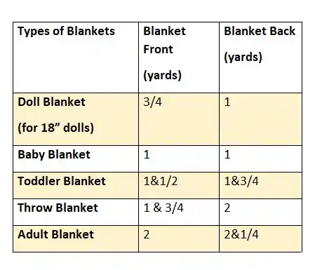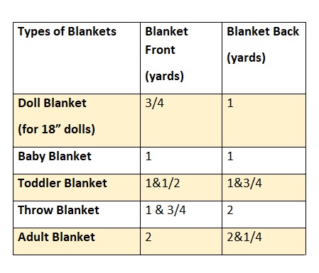 Flannel, minky or fleece for the blanket back- requirement specified in table-1 below.